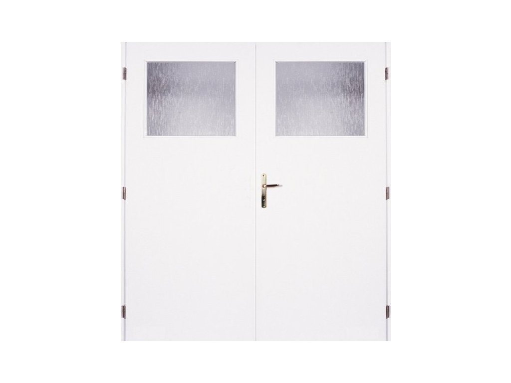 Bílé dvoukřídlé dveře s prosklením v horní třetině, velmi elegantní řešení pro Váš domov. Křídla dveří jsou opláštěna HDF lakovanou deskou a jsou standardně osazeny sklem typu čirá kůra. Jako výplň je zde nejběžněji využívaná voština. Jedná se o tvrzený papír v několika vrstvách, uspořádaný do tvaru šestiúhelníku - včelí plástev o průměru 25 mm. Interiérové dveře se vyrábějí jak v jednokřídlé, tak i dvoukřídlé variantě, ve standardních šířkách jednokřídlých dveří 60 - 110 cm nebo 125 - 185 cm u dveří dvoukřídlých. Standardní výška dveří je 197 cm. Nezapomeňte si ke svým dveřím vybrat odpovídající obložkové zárubně.