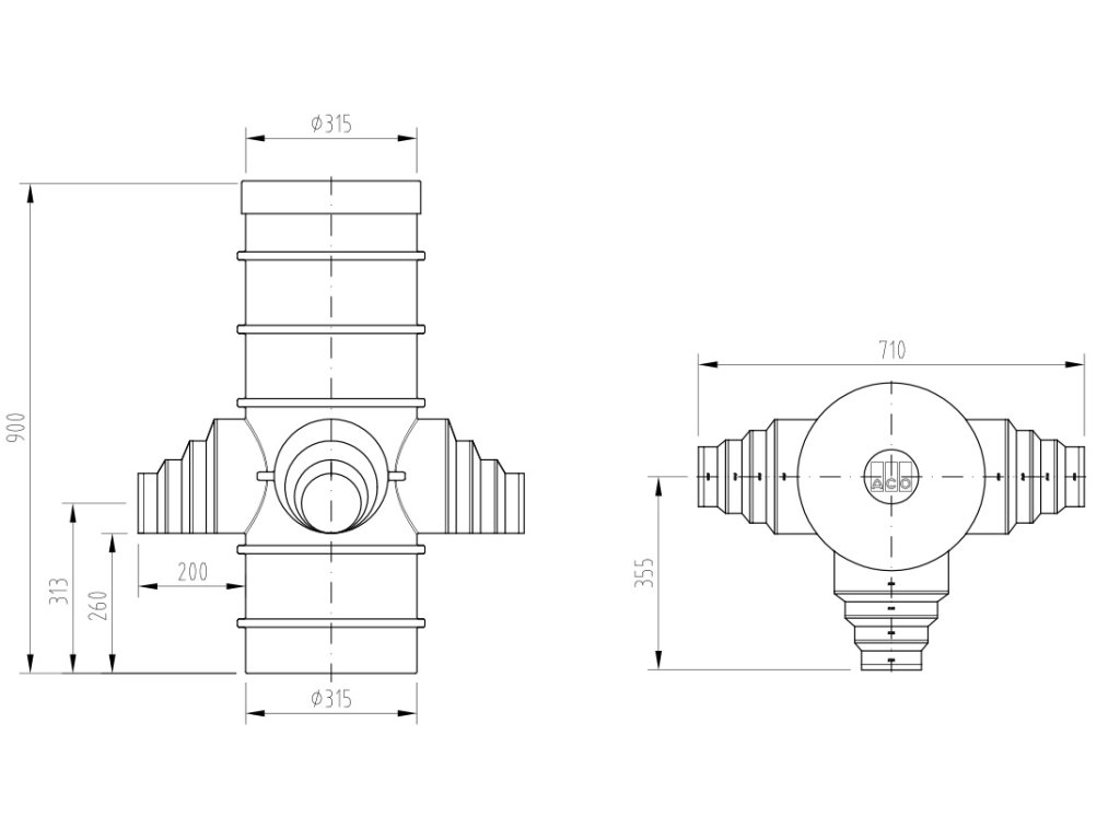- vnější průměr vtoků/odtoků: 100 mm, 125 mm, 160 mm, 200 mm