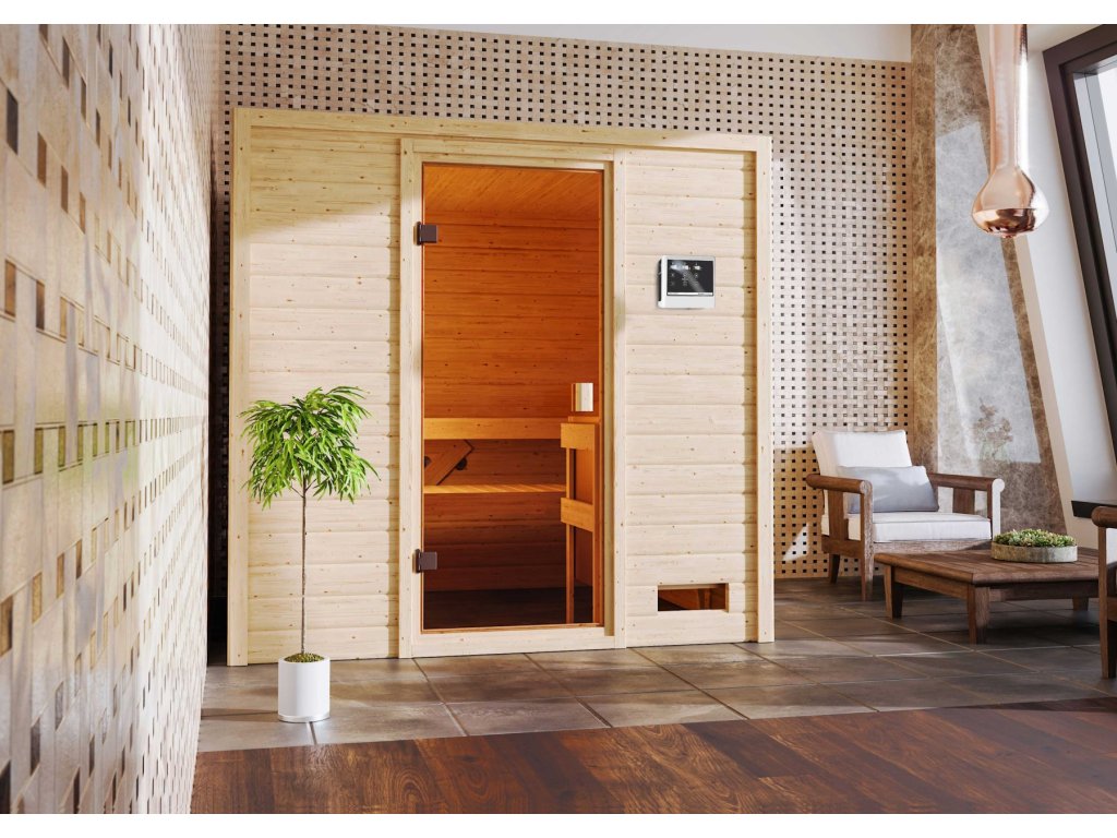 Finská sauna určená pro dvě ležící osoby. Rozměry š 195 x h 169 x v 187 cm. Tento model finské sauny je určený do temperovaných interiérů domu nebo bytu. Její výrobce, firma KARIBU HOLZTECHNIK z německých Brém, dokázala svými výrobky úspěšně navázat na staletou tradici skandinávského saunování a současně do ní zapracovat dnešní moderní technologie. Sauna je celá vyrobena ze dřeva severského smrku v přírodním provedení. Dřevo pochází ze vzdáleného severu Evropy a je chemicky naprosto neošetřené (není ani namořeno ani nalakováno). V důsledku toho je prosté všech známých problematických látek, které by se v průběhu saunování mohly ze dřeva uvolňovat. Tato interiérová sauna je vyrobena z masivního dřeva síly 38 mm. Stěny sauny jsou složeny ze speciálně hlazených prken s dvojitým perem a drážkou, což garantuje neobyčejnou pevnost spoje.