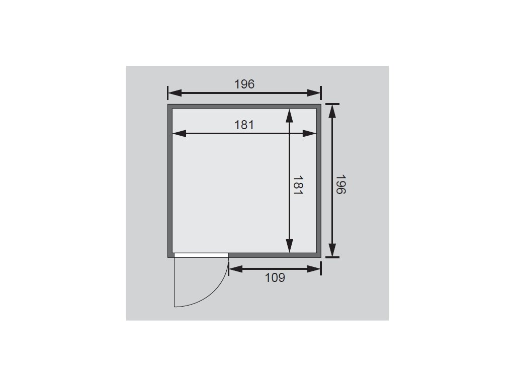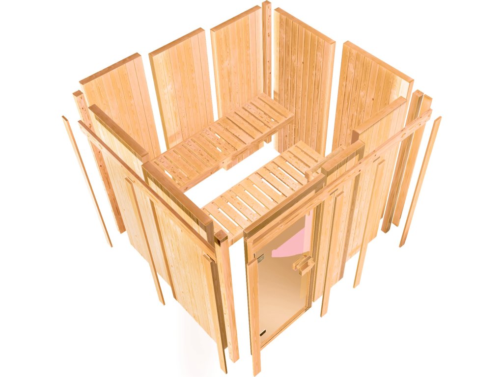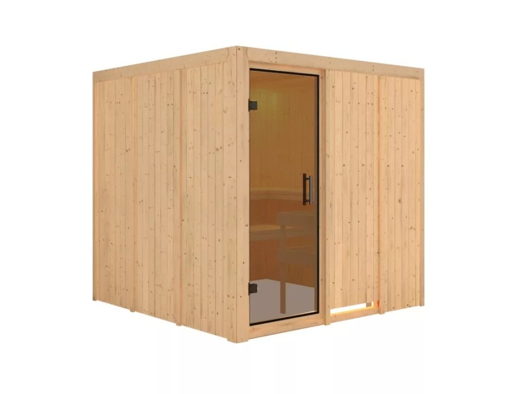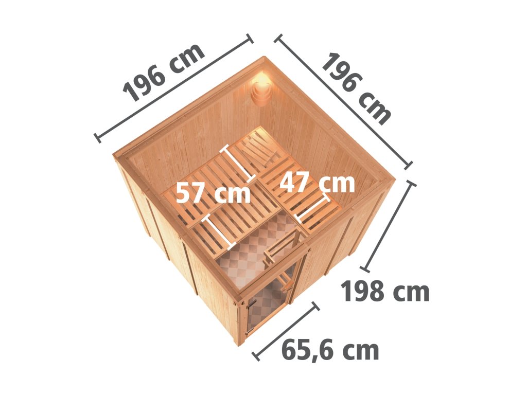 Finská sauna určená pro dvě ležící osoby. Má čtvercový tvar š 196 x h 196 x v 198 cm. Tento model finské sauny je určený do temperovaných interiérů domu nebo bytu. Její výrobce, firma KARIBU HOLZTECHNIK z německých Brém, dokázala svými výrobky úspěšně navázat na staletou tradici skandinávského saunování a současně do ní zapracovat dnešní moderní technologie. Sauna je celá vyrobena ze dřeva severského smrku v přírodním provedení. Dřevo pochází ze vzdáleného severu Evropy a je chemicky naprosto neošetřené (není ani namořeno ani nalakováno). V důsledku toho je prosté všech známých problematických látek, které by se v průběhu saunování mohly ze dřeva uvolňovat. Tato interiérová sauna vykazuje mimořádné tepelně-izolační vlastnosti. Stěny sauny jsou složeny z vnitřní a vnější vrstvy speciálně hlazených prken s perem a drážkou, mezi kterými je 42 mm silná tepelná izolace v podobě minerální vlny. Celková síla stěny je tak 68 mm. Zadní nebo boční nepohledové strany orientované ke stěně místnosti mají vnější stranu ze sololitu. Proto jsou při stejné tepelné izolaci o cca 10 mm tenčí než pohledové strany pokryté palubkami.