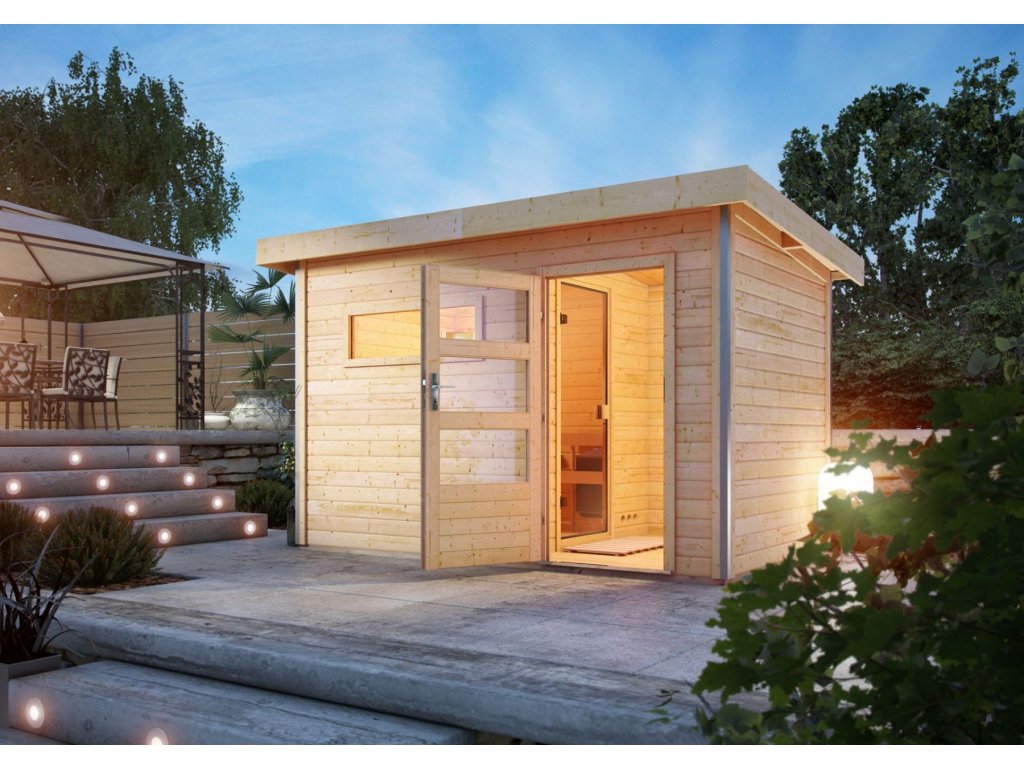Venkovní model finské sauny pro vaši zahradu. Sauna je určená pro 2 ležící osoby. Moderní design s chromovými rohovými lištami. Její výrobce, firma KARIBU HOLZTECHNIK z německých Brém, dokázala svými výrobky úspěšně navázat na staletou tradici skandinávského saunování a současně do ní zapracovat dnešní moderní technologie. Dodáváme jako stavebnici v rozloženém stavu, kde stěny tvoří jednotlivé dřevěné profily, které pouze sesadíte k sobě a sešroubujete, střechu tvoří celistvá deska. To garantuje jednoduchou montáž, kterou zvládne každý domácí kutil. Stěny sauny jsou složeny ze speciálně hlazených prken s dvojitým perem a drážkou, což garantuje neobyčejnou pevnost spoje. Aby teplo z vnitřních prostor sauny nemohlo unikat, je instalován druhý strop z rámové konstrukce s minerální izolační vatou o tloušťce 42 mm.