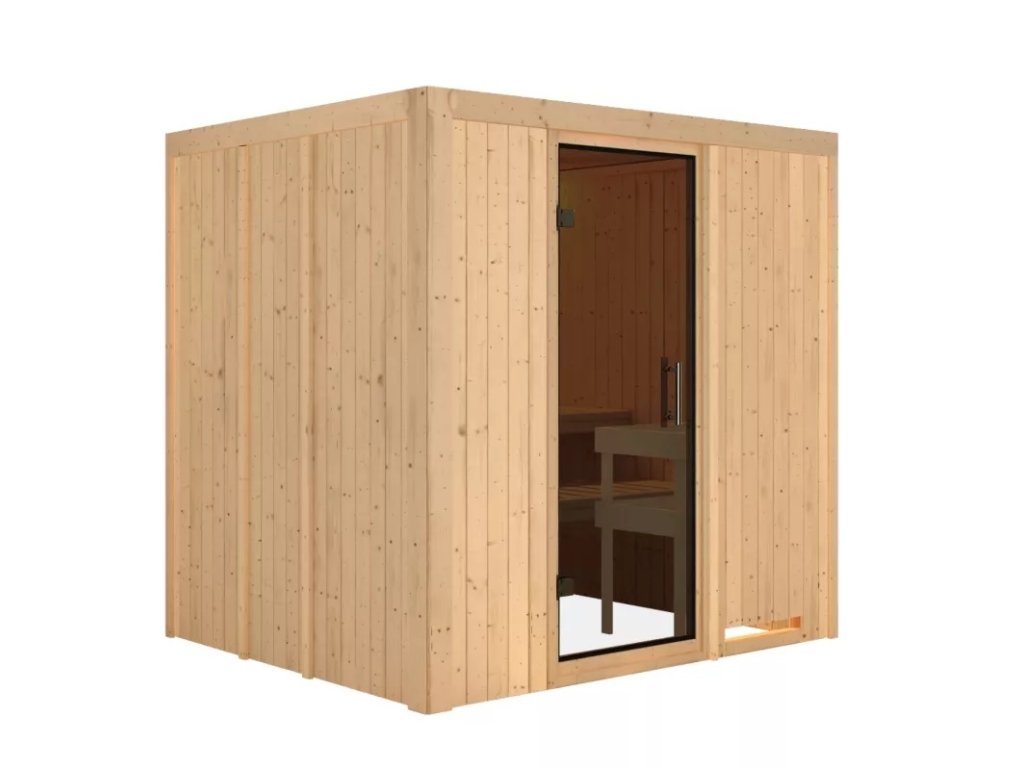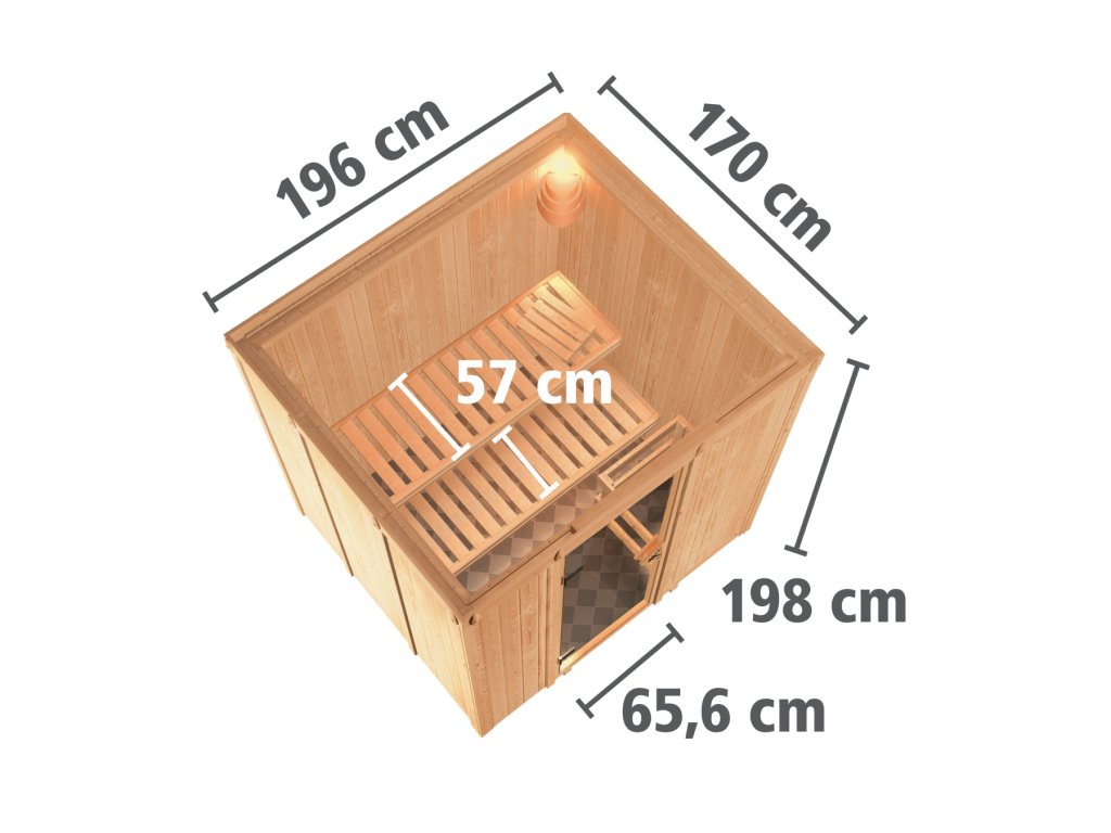 Finská sauna určená pro dvě ležící osoby. Má obdélníkový tvar š 196 x h 170 x v 198 cm. Tento model finské sauny je určený do temperovaných interiérů domu nebo bytu. Její výrobce, firma KARIBU HOLZTECHNIK z německých Brém, dokázala svými výrobky úspěšně navázat na staletou tradici skandinávského saunování a současně do ní zapracovat dnešní moderní technologie. Sauna je celá vyrobena ze dřeva severského smrku v přírodním provedení. Dřevo pochází ze vzdáleného severu Evropy a je chemicky naprosto neošetřené (není ani namořeno ani nalakováno). V důsledku toho je prosté všech známých problematických látek, které by se v průběhu saunování mohly ze dřeva uvolňovat. Tato interiérová sauna vykazuje mimořádné tepelně-izolační vlastnosti. Stěny sauny jsou složeny z vnitřní a vnější vrstvy speciálně hlazených prken s perem a drážkou, mezi kterými je 42 mm silná tepelná izolace v podobě minerální vlny. Celková síla stěny je tak 68 mm. Zadní nebo boční nepohledové strany orientované ke stěně místnosti mají vnější stranu ze sololitu. Proto jsou při stejné tepelné izolaci o cca 10 mm tenčí než pohledové strany pokryté palubkami.