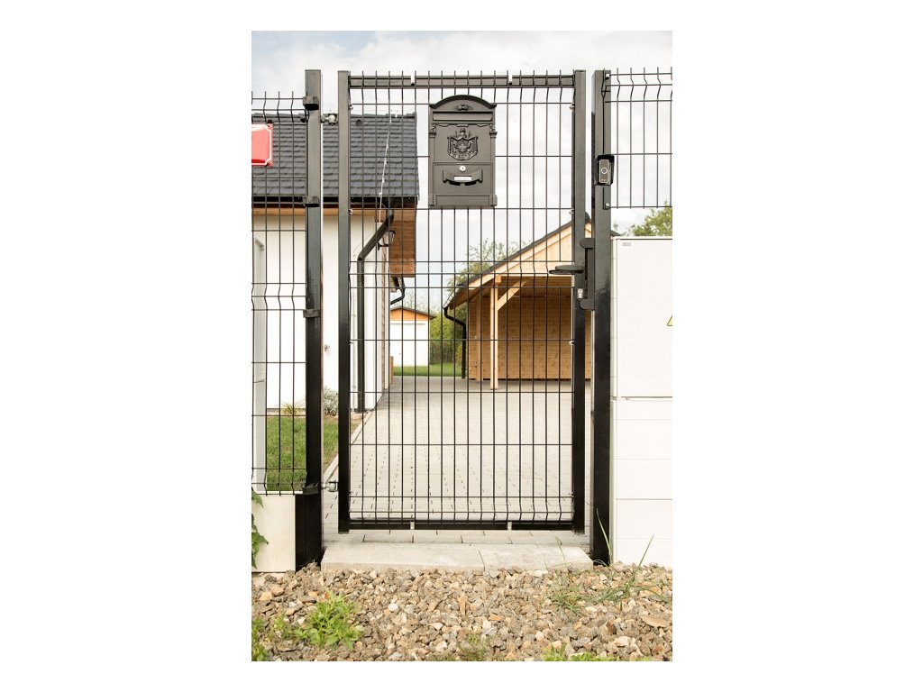 Plotová branka jednokřídlá PILOFOR výplň svařovaný panel s prolisem - 1094 (šířka na střed sloupků) x 1745 mm se zámkem FAB Pilecký.