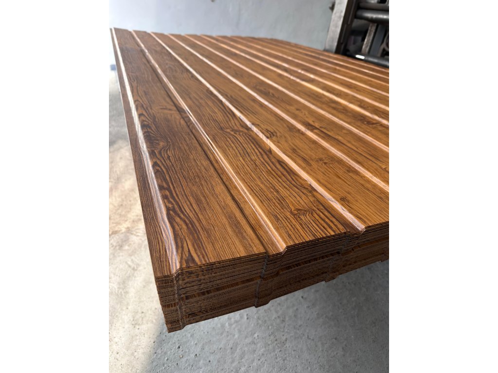 Povrch DŘEVODEKOR - JEDNOSTRANNÝ Polyesterový lak charakterizuje struktura imitující dřevo a odpovídající ochrana před korozí a UV zářením. Tato kombinace umožňuje vnější použití, zvláště tam, kde je požadována vysoká odolnost proti povětrnostním podmínkám a rovněž vysoká estetika. |