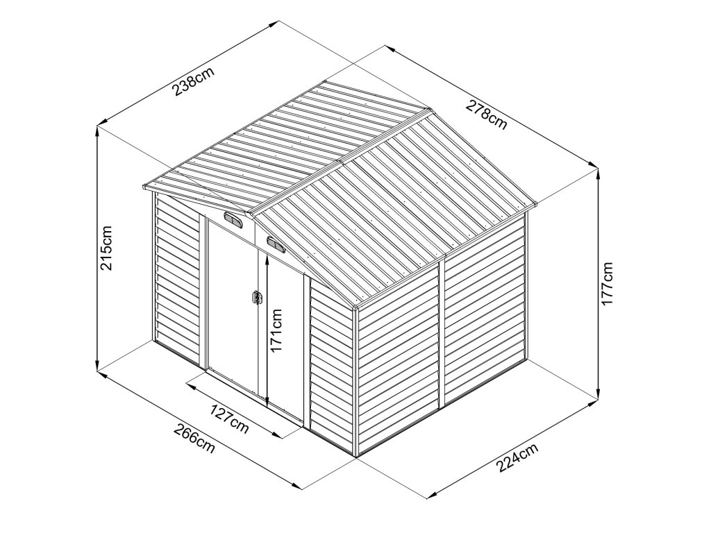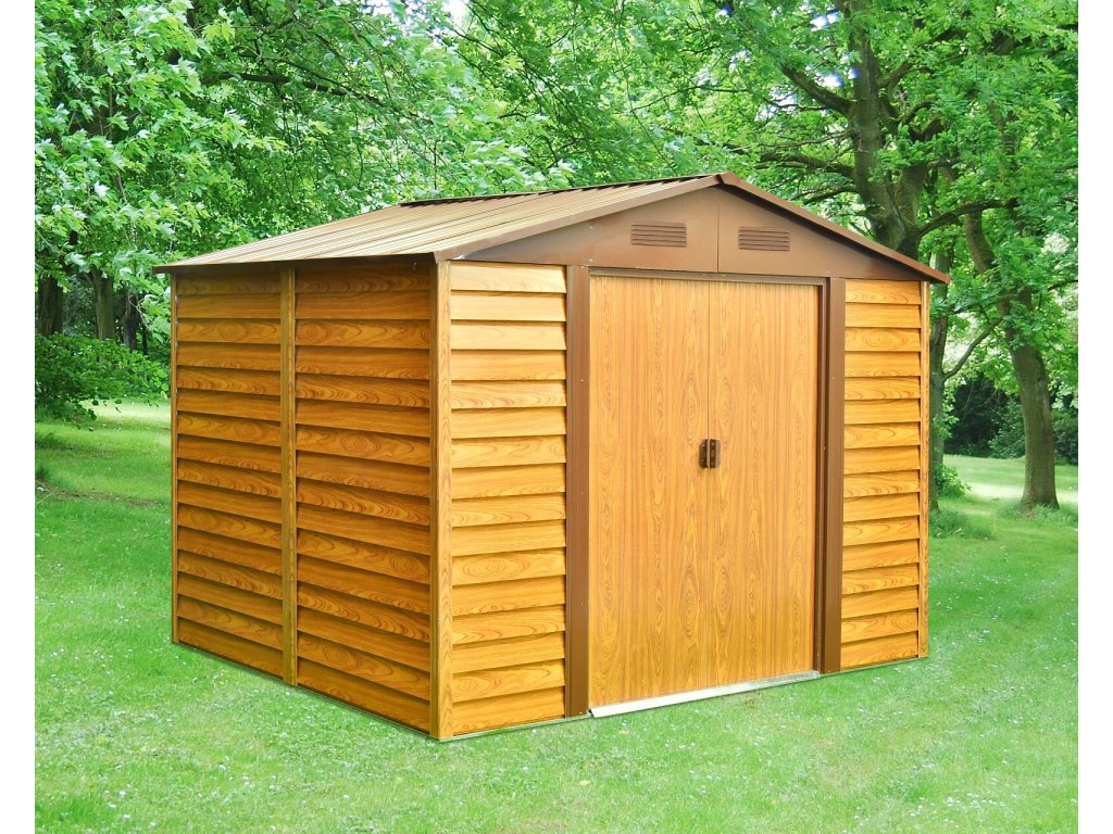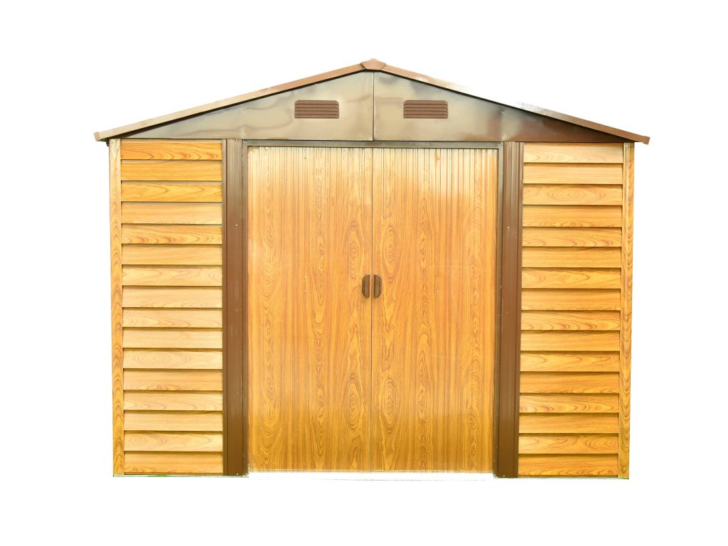 Domek je vyrobený z pozinkovaného vodorovně profilovaného plechu a vzhledově (designově i barevně) se přibližuje dřevěnému domku. Domek je možné použít k uskladnění zahrádkářských, sportovních, bazénových, grilovacích, campingových, motoristických a dalších potřeb. Moderní design, barva, snadná montáž, celoroční použití. Kvalitní materiál s povrchovou úpravou - elektrolyticky pozinkovaný plech s žárově nanesenou barvou. Sedlová střecha, čelní posuvné dveře. Možnost uzamčení (zámek není obsahem dodávky).