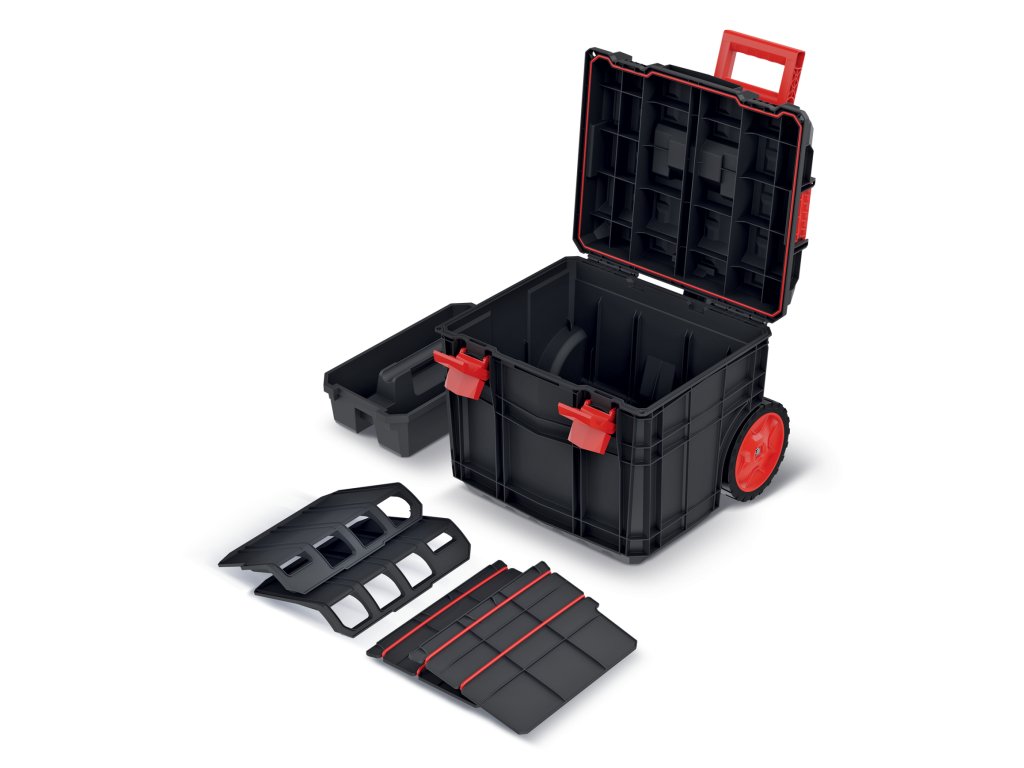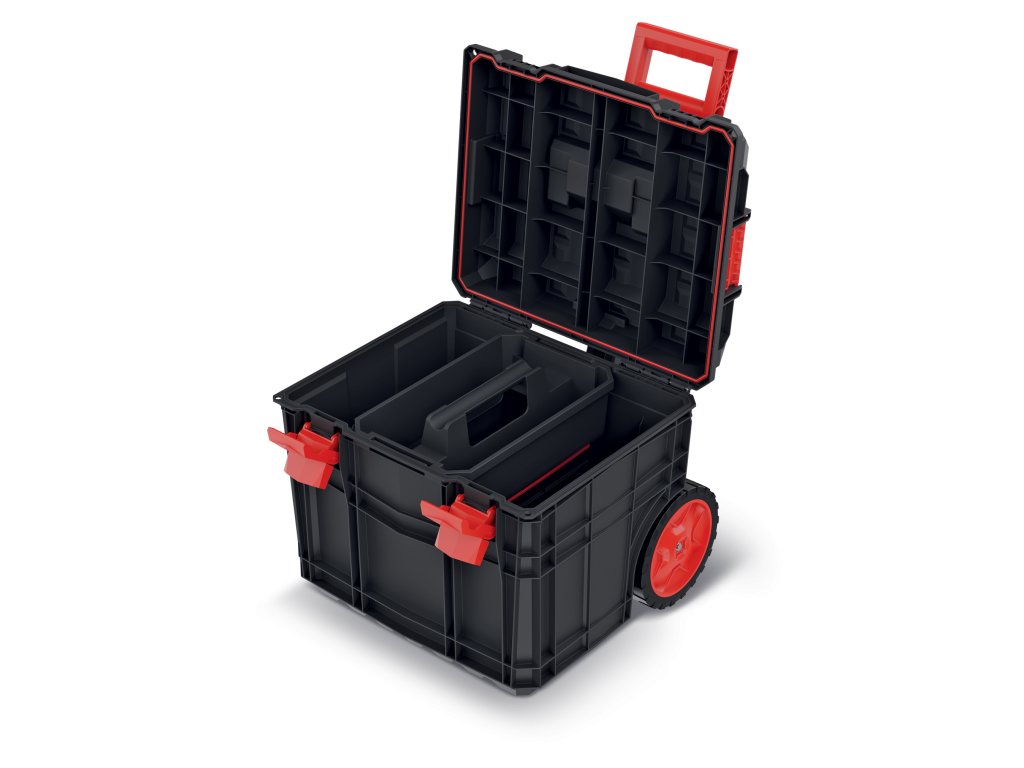 Tento druh dílenského kufru je vybaven těsněním, které zaručuje plnou odolnost vůči prachu i vodě a díky žebrované konstrukci je zajištěna vysoká odolnost vůči mechanickému poškození. Robustní kolečka dokážou přepravit až 100 kg! Pevná rukojeť je teleskopická a snadno nastavitelná. Tři odnímatelné přepážky zajistí variabilitu interiéru boxu, který si tak můžete přizpůsobit podle svých potřeb.