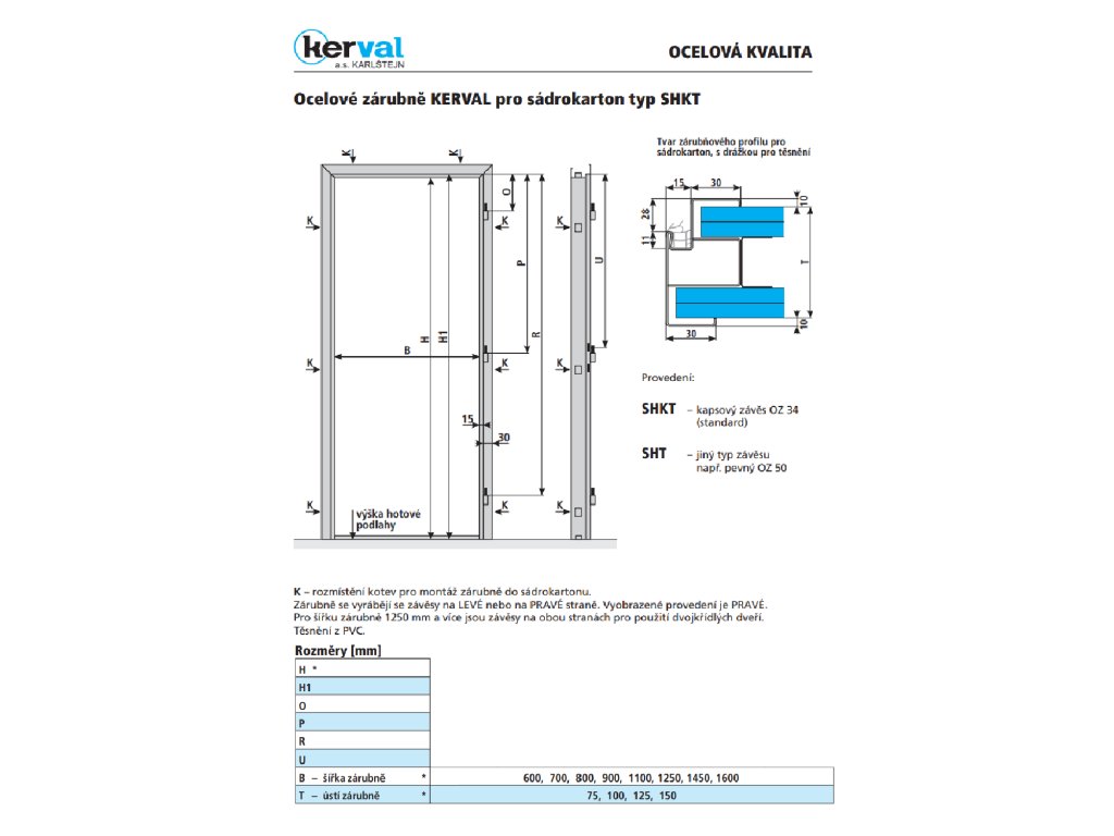 Ocelové zárubně SHKT - 150 / 600 mm sádrokarton (těsnění, závěs OZ34)