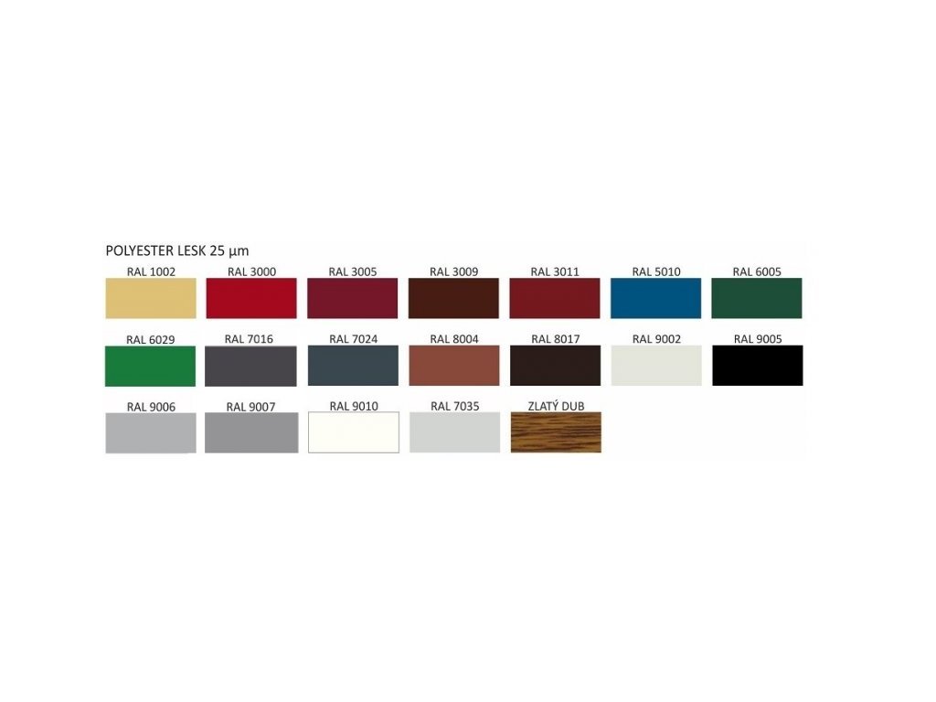 POLYESTER STANDARD - tento typ povlaku je aplikován na plechy z pozinkovaného plechu o hmotnosti nejméně 275 g / m2. Tloušťka organického vrchní vrstvy je v tomto případě 25 μm (5 μm spodní vrstva + 20 μm vnější vrstva). Jeho vzhled se vyznačuje hladkostí a leskem. Dostupné barvy jsou určeny podle barevné palety RAL. |