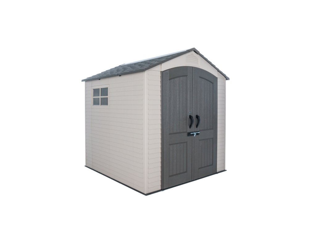 Robustní plastový domek "nové generace" LIFETIME FOX 60014 / 60190 k uskladnění zahrádkářských, sportovních, bazénových, grilovacích, campingových, motoristických a dalších potřeb. Moderní design, snadná montáž, celoroční použití. Zahradní domek má nosnou kovovou konstrukci a dvojité stěny, střecha, dvojité dveře, podlaha jsou vyrobeny z masivního velmi odolného a prakticky nerozbitného plastu. Plastová protiskluzová podlaha je součástí domku (je v ceně). Domek je vybaven dvoukřídlými dveřmi na pantech. Síla dvojité plastové stěny je 26 mm. Sklon střechy je 30°, což výrazně snižuje množství a tlak sněhu na střechu. Materiál domku (extrémně odolný polyethylen s UV filtrem) nežloutne ani nekřehne, takže odpadá pravidelné natírání domku jako je nutné v případě např. dřevěných domků - zahradní plastový domek je prakticky bezúdržbový. Domek je navržen a vyroben tak, aby montáž byla co nejjednodušší a nejkratší. Jednotlivé díly pouze zaklapnete do sousedních dílů a spoj zajistíte šroubkem.