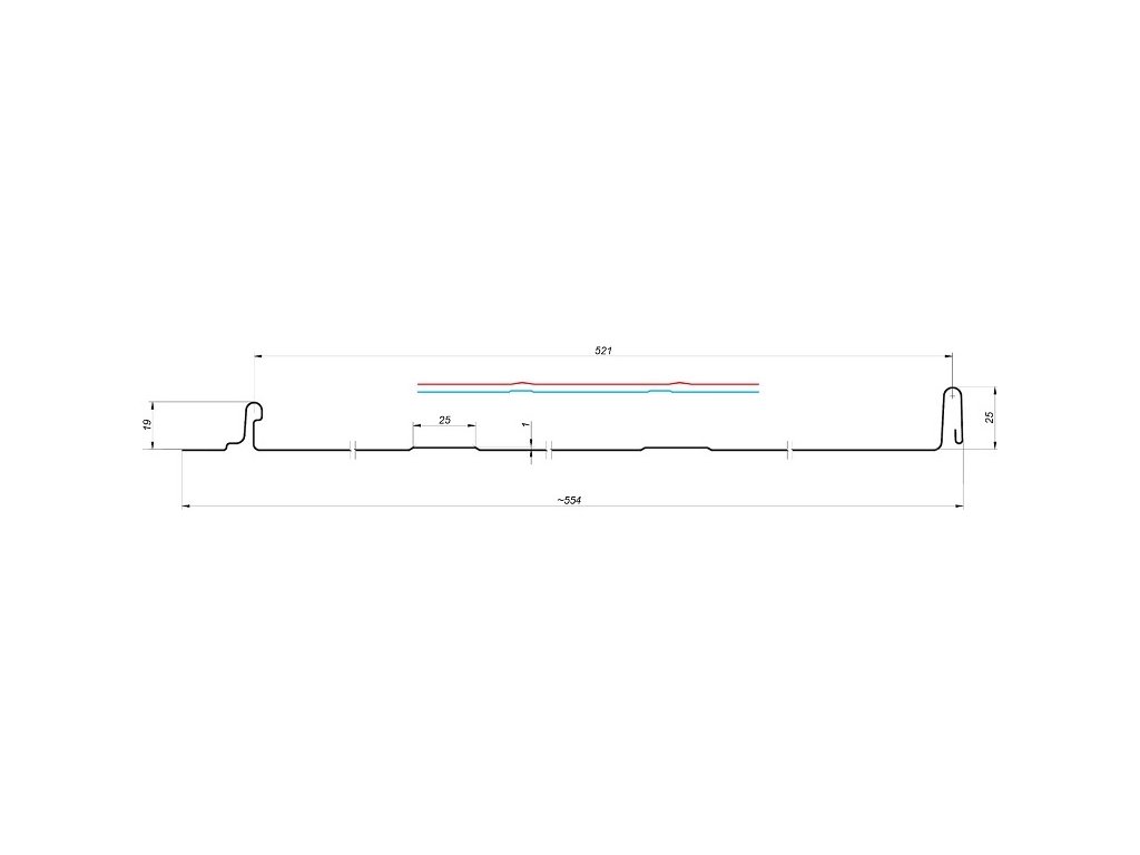 Sklon střechy: minimálně 9° Celková šířka: ∼ 554 mm Efektivní šířka: 521 mm Tloušťka: 0,5 mm Výška drážky: 25 mm Výška "clik": 19 mm Délka tabule: min 1400 / max. 8000 mm Hmotnost: ∼ 4,5 kg / m2 |