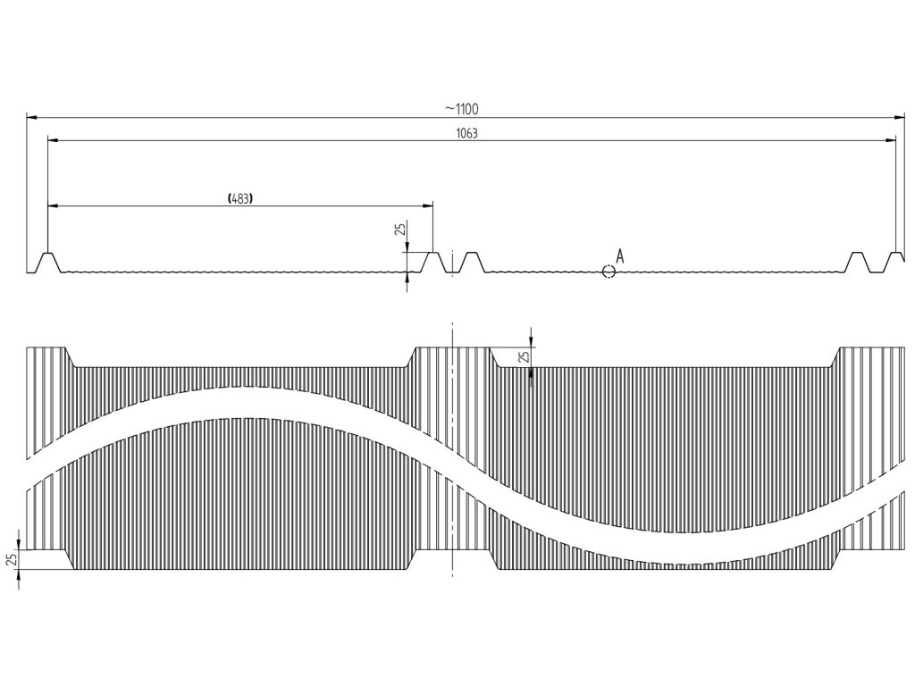 Sklon střechy: minimálně 9° Celková šířka: ∼ 1100 mm Efektivní šířka: 1063 mm Tloušťka: 0,6 mm Hloubka profilu: 25 mm Délka tabule: min 1400 / max. 8000 mm Hmotnost: ∼ 4,5 kg / m2 |