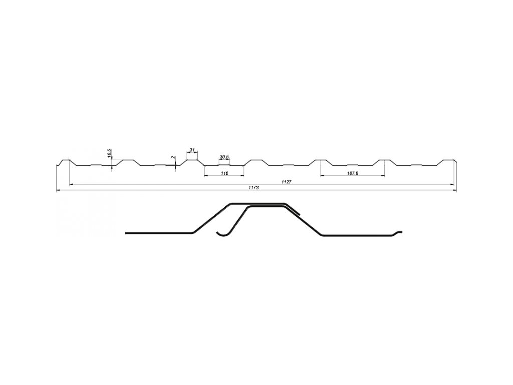 sklon střechy od 5° výška profilu: 16,5 mm celková šířka: 1173 mm efektivní šířka: 1127 mm délka tabule: 1500 mm tloušťka plechu: 0,5 mm |