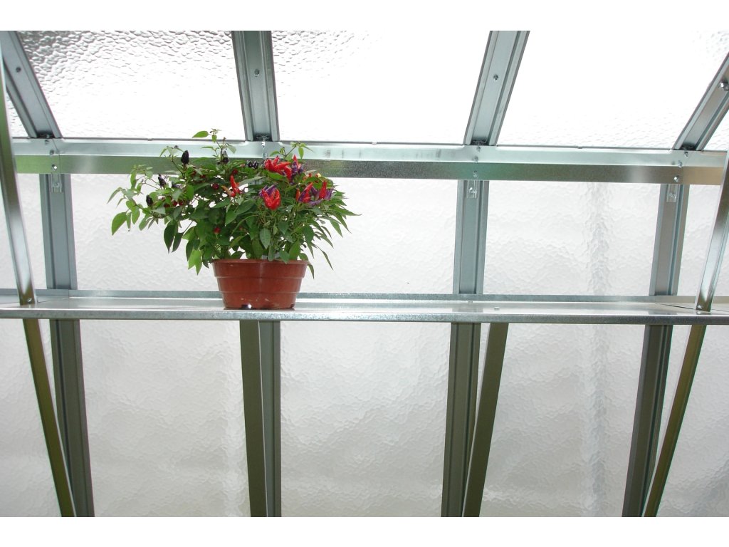 Police z pozinkovaného plechu o síle 1 mm pro skleník pro skleníky VARIANT L a VARIANT C. Délka police je 1,5 m. Nelze ji umístit do stejného modulu spolu s bočním oknem.