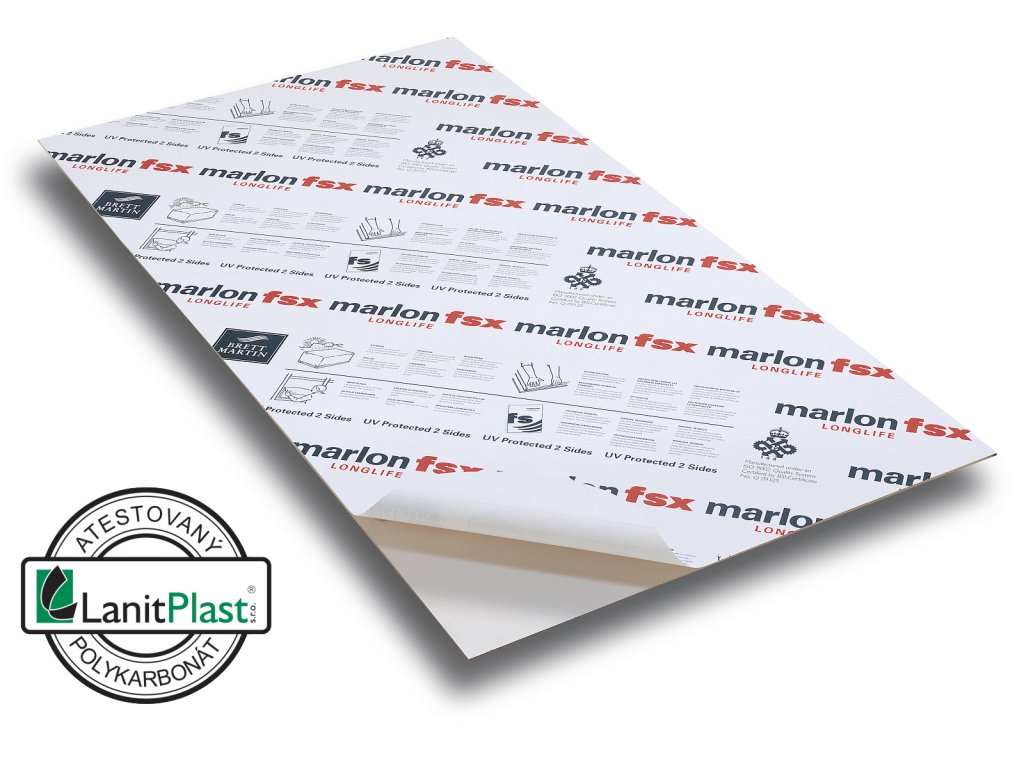 MARLON FSX 2 mm - plná polykarbonátová deska od renomovaného britského výrobce BRETT MARTIN Ltd. Jedná se o jeden z nejkvalitnějších polykarbonátů na evropském trhu. Deska je svým vzhledem shodná se skleněnou tabulkou. Výraznou vlastností plných polykarbonátových desek je jejich extrémní pružnost a nerozbitnost.