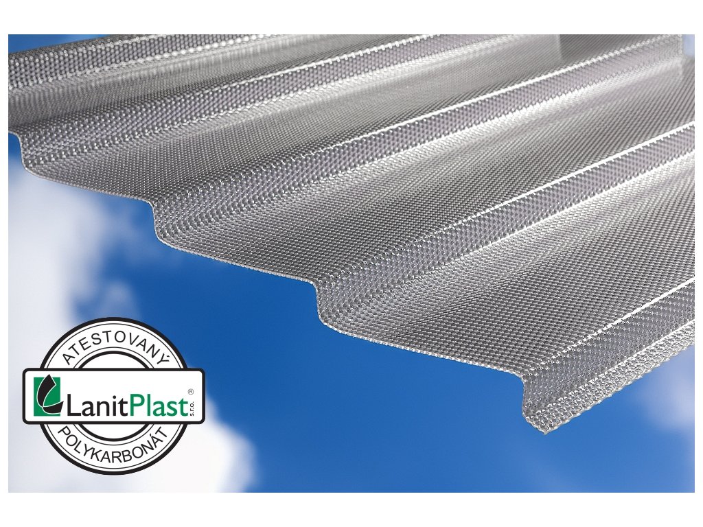 MARLON CSE DIAMOND Z-TOP - extrémně robustní polykarbonátový panel síly 2,8 mm s povrchovou strukturou - vytlačené šestihrany podobné plástvím na vnitřní straně určené pro rozptyl světla. Povrchová struktura láme světlo, takže desky nejsou úplně průhledné, ale průsvitné a vzniká pod nimi příjemný jemný chládek při zachování světelné propustnosti. Část paprsků díky svému lomu na krupičce zůstane v materiálu, takže se panel při nasvícení sluncem rozzáří. Povrchová struktura je vyrobena mechanicky vylisováním na vnitřní povrch panelu. Panely mají zesílený oboustranný koextrudovaný (přitavený) 2UV filtr, vlivem slunce nežloutnou ani nekřehnou.