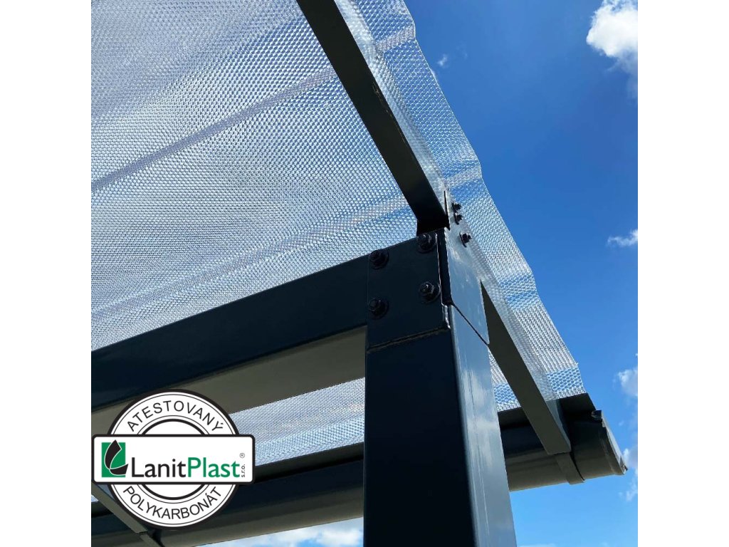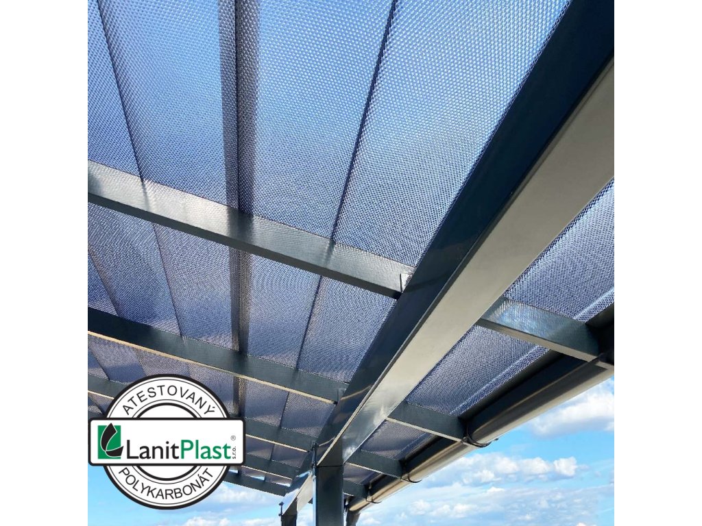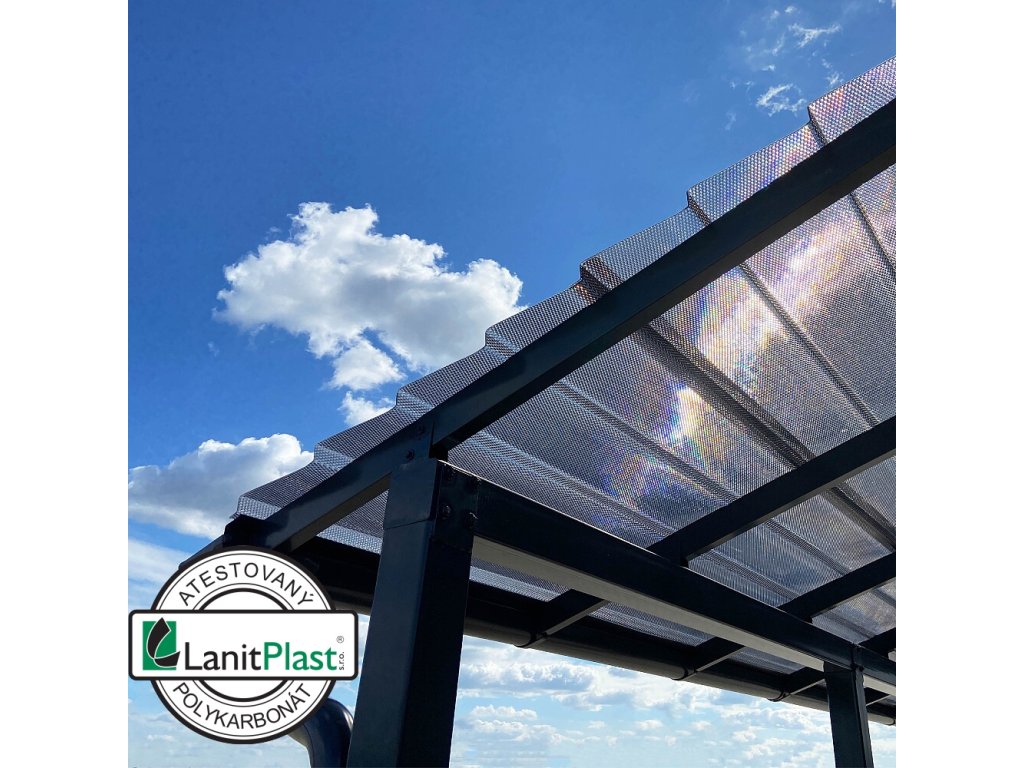 MARLON CSE DIAMOND Z-TOP - extrémně robustní polykarbonátový panel síly 2,8 mm s povrchovou strukturou - vytlačené šestihrany podobné plástvím na vnitřní straně určené pro rozptyl světla. Povrchová struktura láme světlo, takže desky nejsou úplně průhledné, ale průsvitné a vzniká pod nimi příjemný jemný chládek při zachování světelné propustnosti. Část paprsků díky svému lomu na krupičce zůstane v materiálu, takže se panel při nasvícení sluncem rozzáří. Povrchová struktura je vyrobena mechanicky vylisováním na vnitřní povrch panelu. Panely mají zesílený oboustranný koextrudovaný (přitavený) 2UV filtr, vlivem slunce nežloutnou ani nekřehnou.
