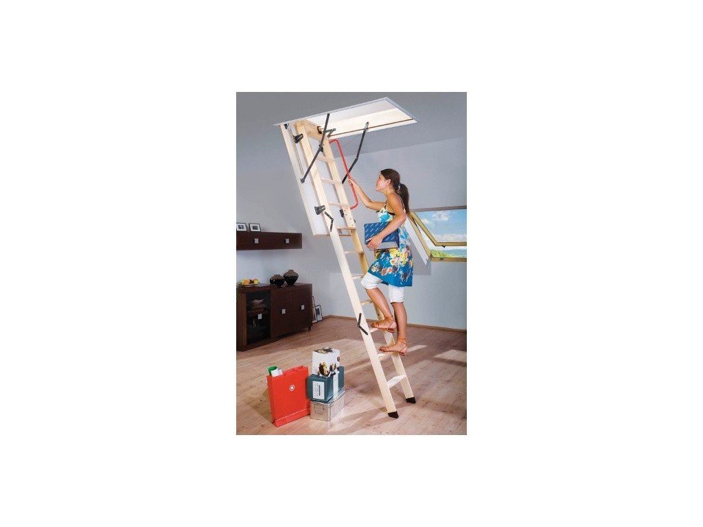 Skládací půdní schody FAKRO LWK Komfort umožňují snadný a bezpečný výstup na podkroví. Obsahují třídílný dřevěný žebřík, kovovou tyč pro snadnou manipulaci s poklopem i zámkem a také zateplený bílý poklop. Schody jsou kompletně smontovány a v průběhu skládání a rozkládání žebříku nevyžadují mnoho prostoru. Tento typ půdních schodů s 3 cm termoizolační polystyrenovou vrstvou splňuje veškeré technické a bezpečnostní požadavky.