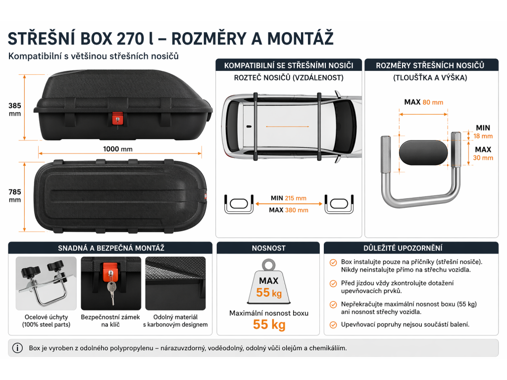 Montáž a kompatibilita se střešními nosníkyStřešní box je navržen pro snadnou a rychlou montáž na většinu běžných střešních nosníků („zahrádek“). Díky univerzálnímu upevňovacímu systému jej lze připevnit bez speciálního nářadí. Box je kompatibilní s nosníky o následujících rozměrech: