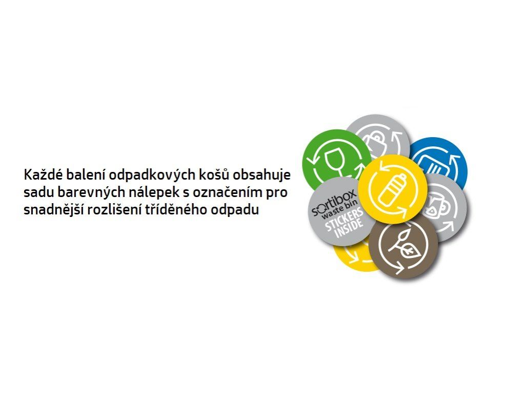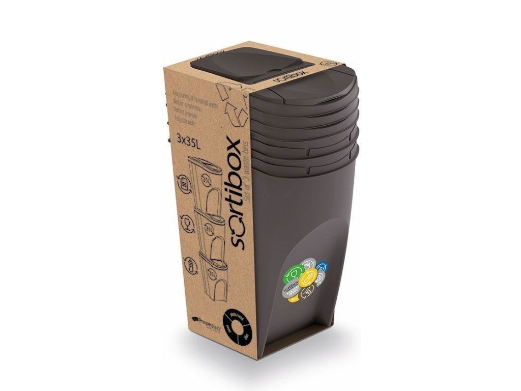 Sada tří antracitových odpadkových košů SORTIBOX je vynikajícím pomocníkem do každé domácnosti pro snadné a pohodlné třídění odpadu. Konstrukce těchto košů je speciálně navržená tak, aby se každá sada vešla do omezených a ztížených prostorů. Esteticky zpracované a objemné koše je možné sestavit do řad nebo sloupců. Součástí balení jsou barevné nálepky, díky kterým si můžete lehce označit každý koš zvlášť a konkrétně si tak určit, pro jaký typ odpadu mají být jednotlivé koše využívány.