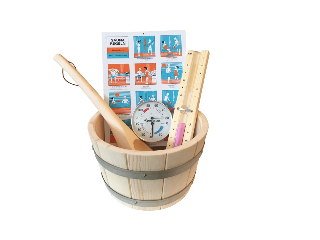 Saunový balíček obsahuje veškeré základní příslušenství, které potřebujete pro dokonalé saunování. Aby byla teplota neustále pod kontrolou, obsahuje souprava teploměr i vlhkoměr. Má průměr 10 cm, kovové pouzdro a chromovaný rám. Přesýpací hodiny ukazují čas saunování (15 minut) a dají tak impuls k ochlazovací fázi. Souprava dále obsahuje smrkové vědro na vodu s plastovou vložkou a dřevěnou lžíci.