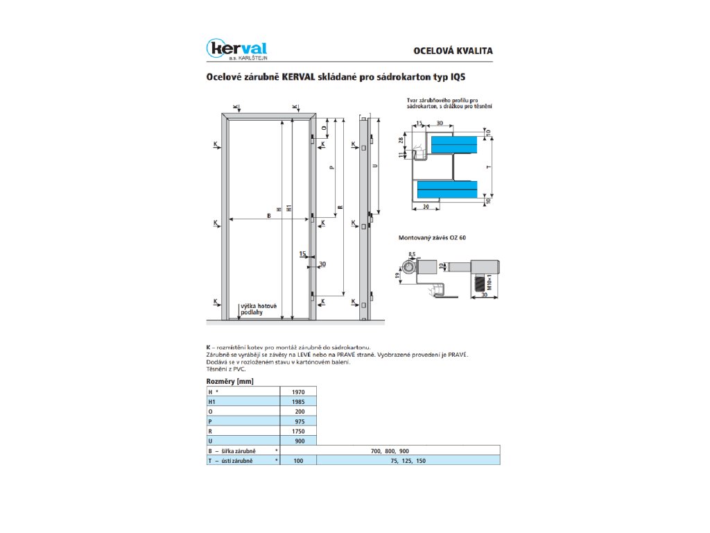 Skládané ocelové zárubně IQS - 100 / 600 mm sádrokarton (těsnění, závěs OZ60)