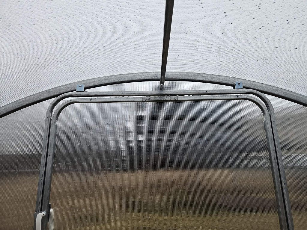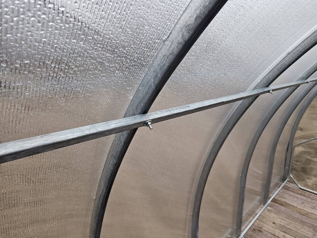 Konstrukce skleníku je z masivních obloukových trubek 40 x 20 mm (podélníky a vzpěry 20 x 20 mm). Materiál profilů je galvanicky pozinkovaný = na povrchu je vytvořená silná vrstva ochranného nekorodujícího zinku. Jednotlivá žebra nosných oblouků jsou od sebe vzdálena pouhých 67 cm, což je velká výhoda tohoto modelu skleníku oproti jiným výrobkům na českém trhu. Malá rozteč oblouků, profil 40 x 20 mm a fakt, že jsou vyrobeny z jednoho kusu oceli garantuje extrémní únosnost celé konstrukce skleníku. Přední a zadní čela skleníku jsou z výroby sešroubované a tvoří jednolitý celek. Přední i zadní čelo mají jednokřídlé dělené dveře na pantech (horní a spodní díl, kdy horní díl funguje jako samostatné okénko). Skleník je tedy PRŮCHOZÍ. Jako příplatkové příslušenství lze dokoupit automatický otvírač.