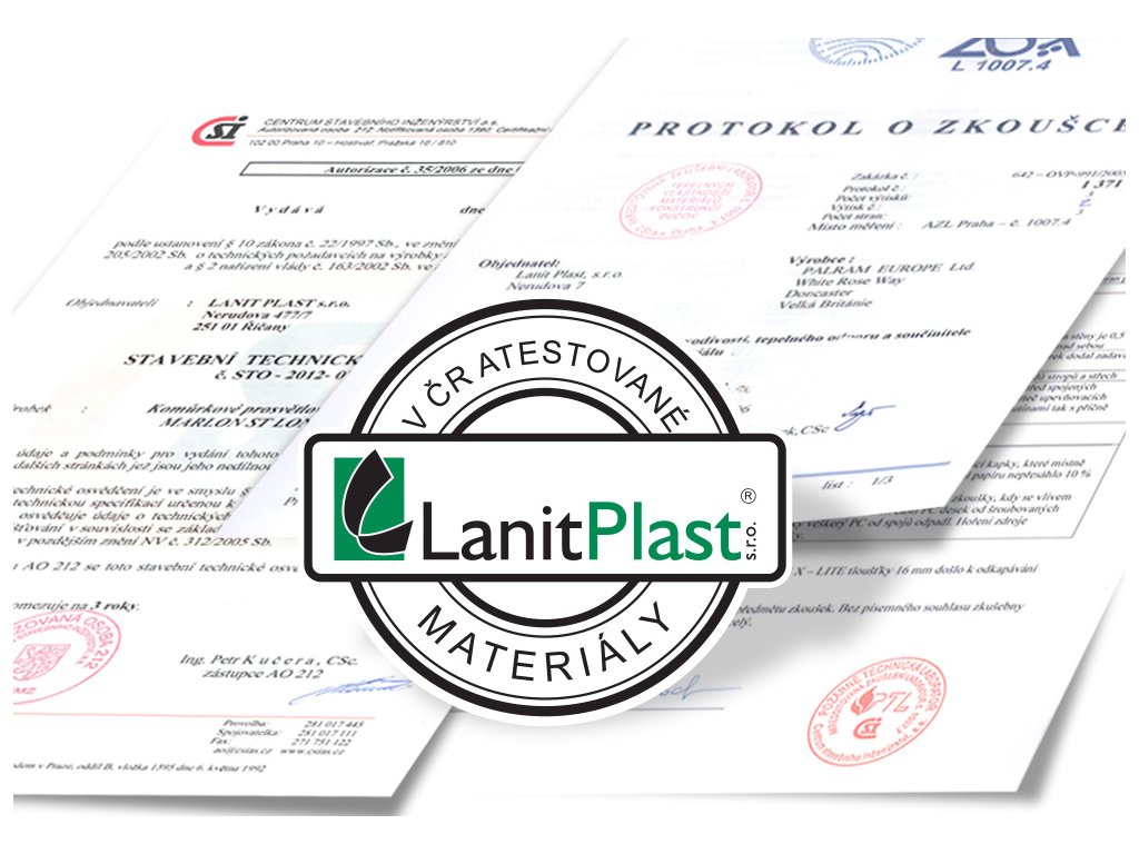 Prémiový britský dvoustěnný polykarbonát 6 mm se silným UV filtrem (proto na slunci nežloutne a nekřehne). Z důvodu zajištění maximální kvality skleníku dodáváme ke konstrukci prosklení z kvalitního polykarbonátu MARLON (výrobce Brett Martin Velká Británie), který v ČR prošel náročnými testy ve státem akreditovaných zkušebnách jako stavební materiál. Navíc disponuje zkušebním protokolem ze Státního zdravotního ústavu Praha, který potvrzuje, že se z polykarbonátu neuvolňují žádné škodlivé látky. Můžete tak nerušeně pěstovat zeleninu bez obav o své zdraví. Smluvní prodloužená záruka 10 let na nerozbitnost polykarbonátu krupobitím je u skleníků od LANIT PLASTU samozřejmostí.