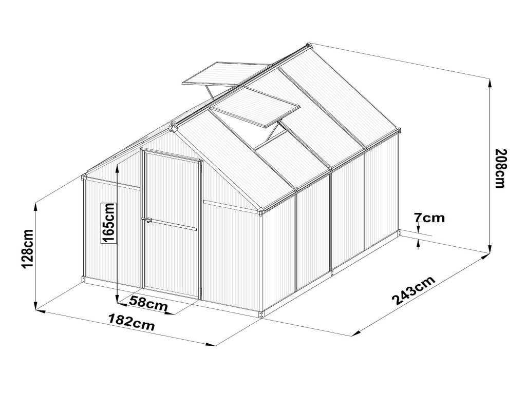 Obsahem balení jsou jednokřídlé dveře na pantech (š x v otvoru = 0,58 x 1,65 m), AL profily, prosklení, pozinkovaná ocelová základna, 2x střešní ventilační okénko s manuálním otevíráním, veškerý spojovací materiál. Ke skleníku je možné dokoupit řadu nadstandardního příslušenství - regály, automatické otvírače, teploměry, vlhkoměry, zavlažovací zařízení, elektrické odporové vytápění půdy.