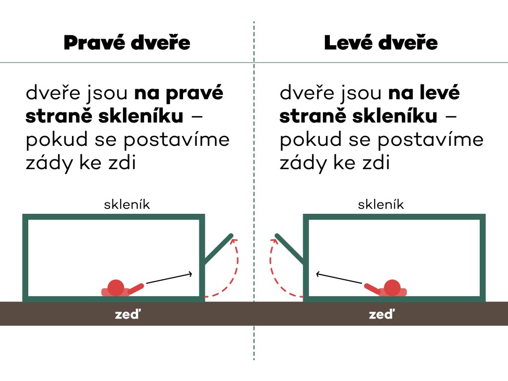 - U skleníků ke zdi se rozlišují pravé a levé dveře, a to i u prodloužených dveří - pokud se postavíte zády ke zdi, levá a pravá ruka vám určí levé a pravé dveře (viz fotogalerie)