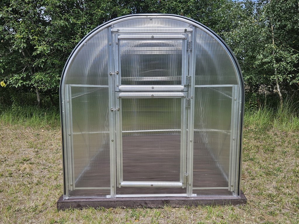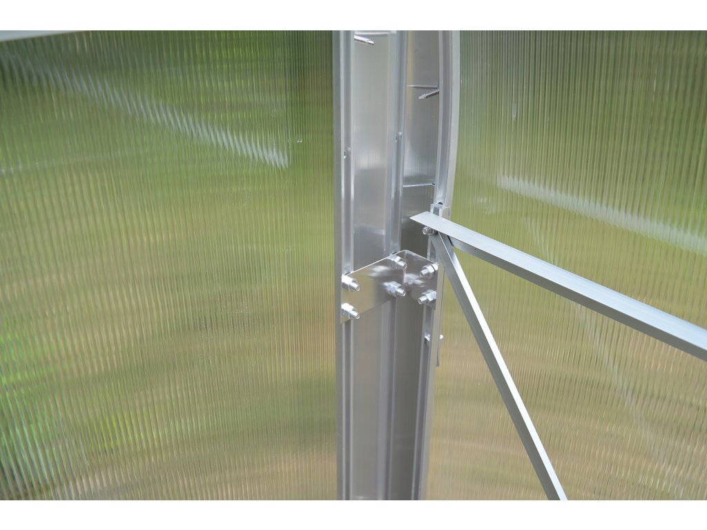 Konstrukce skleníku je sešroubovaná z masivních 1 mm silných a 65 mm širokých eloxovaných hliníkových profilů. Všechny šroubované spoje jsou s hliníkových šroubů a matek, panty a petlice jsou vyrobené z nerezové oceli, takže se jedná o korozi absolutně odolný skleník. Jednotlivá žebra nosných oblouků jsou od sebe vzdálena osově 100 cm. Přední čelo má dvoudílné dveře na pantech, zadní čelo obsahuje větrací okénko. Skleník není průchozí. Jako příplatkové příslušenství lze dokoupit různé druhy regálů, teploměry, vlhkoměry apod.
