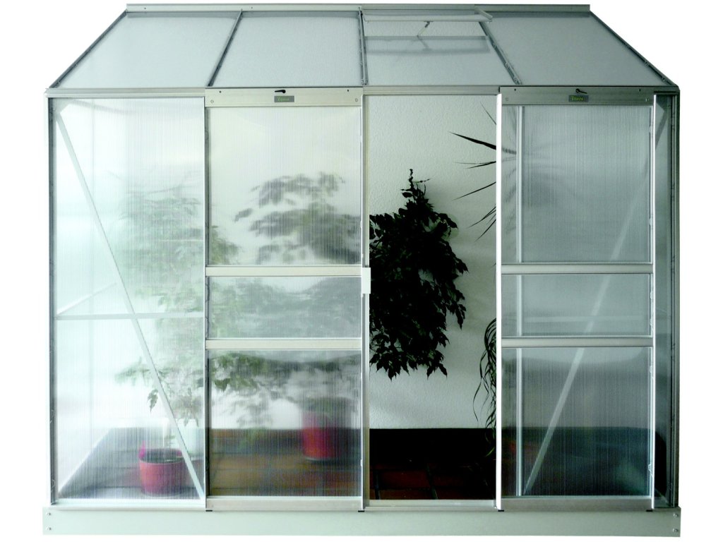 Skleník je vybaven dvoukřídlými dveřmi (velikost 1,22 x 1,63 m), AL profily, prosklením, 1x střešním ventilačním okénkem s manuálním otevíráním, veškerým spojovacím materiálem. Skleník lze postavit buď na zděnou podezdívku (pak není nutné dokupovat základnu z pozinkovaného plechu) nebo na základnu z pozinkovaného plechu (nutno dokoupit). Při stavbě bez zděné podezdívky dokoupení základny určitě doporučujeme. Ke skleníku je možné dokoupit řadu nadstandardního příslušenství - poličky, regály, teploměry, vlhkoměry, zavlažovací zařízení, elektrické odporové vytápění půdy.