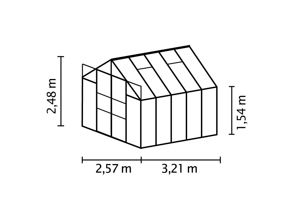 Obsahem balení jsou dvoukřídlé posuvné dveře (š x v otvoru = 1,22 x 1,91 m), AL profily, prosklení, 4x střešní ventilační okénko s manuálním otevíráním, veškerý spojovací materiál. Skleník lze postavit např. na zděnou podezdívku nebo na základnu z pozinkovaného plechu. Při stavbě bez podezdívky dokoupení základny doporučujeme. Ke skleníku je možné dokoupit řadu nadstandardního příslušenství - poličky, regály, další větrací střešní i boční okénka, automatické otvírače k těmto okénkům, okapové sady, teploměry, vlhkoměry, zavlažovací zařízení, elektrické odporové vytápění půdy.