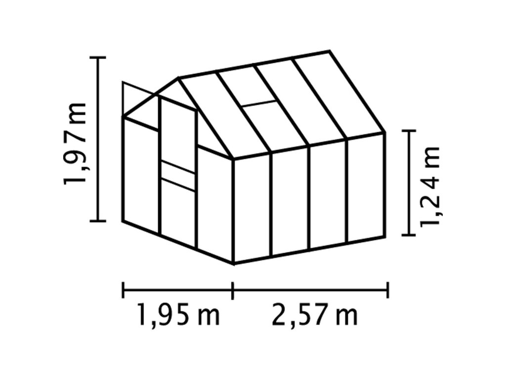 Obsahem balení jsou jednokřídlé posuvné dveře (š x v otvoru = 0,61 x 1,61 m), AL profily, prosklení, 1x střešní ventilační okénko s manuálním otevíráním, veškerý spojovací materiál. Skleník lze postavit např. na zděnou podezdívku nebo na základnu z pozinkovaného plechu. Při stavbě bez podezdívky dokoupení základny jednoznačně doporučujeme. Ke skleníku je možné dokoupit řadu nadstandardního příslušenství - poličky, regály, další větrací střešní i boční okénka, automatické otvírače k těmto okénkům, okapové sady, teploměry, vlhkoměry, zavlažovací zařízení, elektrické odporové vytápění půdy. Skleník dodáváme jako stavebnici s podrobným montážním návodem. Baleno v papírovém kartonu.