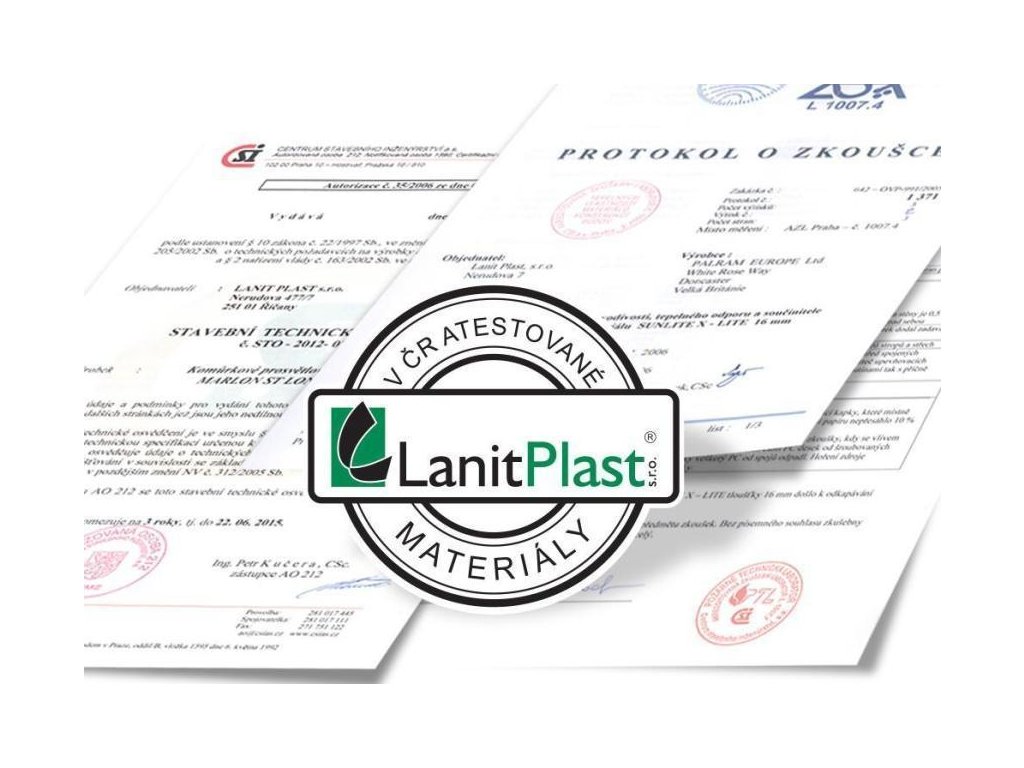 Polykarbonát - prémiový britský dvoustěnný polykarbonát 6 mm se silným UV filtrem (proto na slunci nežloutne a nekřehne). Z důvodu zajištění maximální kvality skleníku dodáváme ke konstrukci prosklení z kvalitního polykarbonátu MARLON (výrobce Brett Martin Velká Británie), který v ČR prošel náročnými testy ve státem akreditovaných zkušebnách jako stavební materiál. Navíc disponuje zkušebním protokolem ze Státního zdravotního ústavu Praha, který potvrzuje, že se z polykarbonátu neuvolňují žádné škodlivé látky. Můžete tak nerušeně pěstovat zeleninu bez obav o své zdraví. Smluvní prodloužená záruka 10 let na nerozbitnost polykarbonátu krupobitím je u skleníků od LANIT PLASTU samozřejmostí.