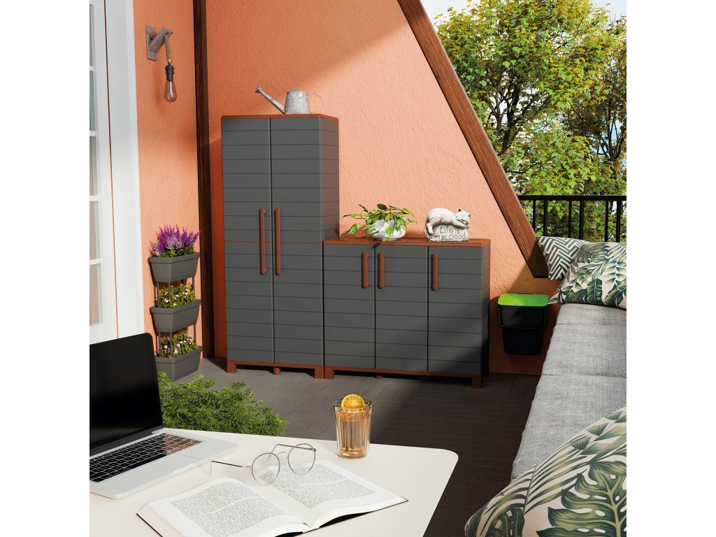 Plastová skříň ART PLAST Portofino v antracitovém provedení je ideálním řešením pro přehledné uložení věcí v interiéru i exteriéru. Díky kompaktním rozměrům 102 × 37 × 90 cm se skvěle hodí do garáže, dílny, technické místnosti, na balkon nebo do zahradního domku.