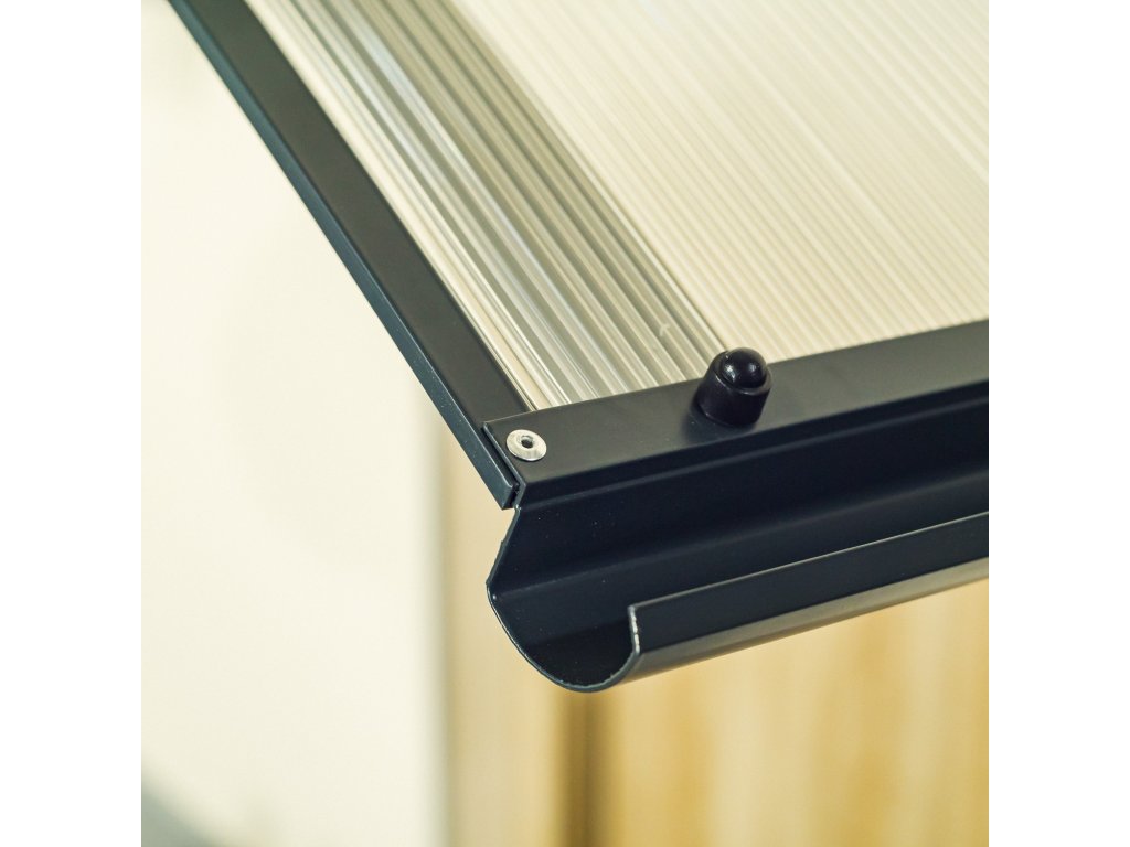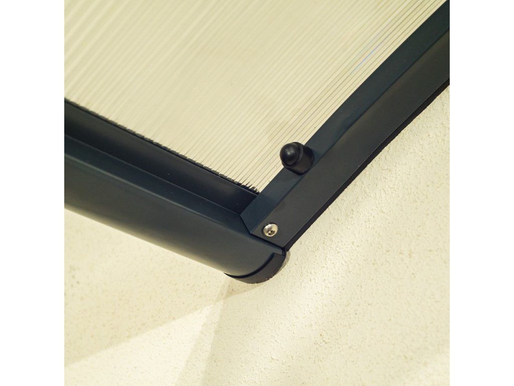 Stříška nad dveře vyrobená z práškově lakovaného hliníku. Na rozdíl od stříšek s plastovou konstrukcí hliníková konstrukce perfektně odolává vlivům počasí, i po letech je pevná a stabilní. V zimě mrazem nekřehne a ani na silném letním slunci nedochází ke změnám barvy. Stříška je zasklená komůrkovým polykarbonátem síly 4,5 mm s oboustranným UV filtrem (značka LEXAN® - vyrobeno v Rakousku). Jde o velmi kvalitní značkový polykarbonát od jednoho z nejlepších světových výrobců.