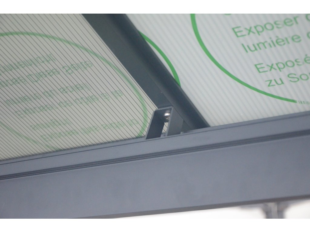 Zahradní hliníkový altán LANITPLAST 33 poskytuje potřebný stín pro posezení na zahradě. Nejedná se o běžný lehký altán s trubkovou skládací konstrukcí (jako je běžně ke koupi v hobbymarketech), ale o masivní výrobek zhotovený ze silných vzájemně sešroubovaných hliníkových profilů (síla 1,0 mm) určený k pevné montáži k zemi pomocí patek. Hliníkové profily jsou ochráněny práškovou vypalovací barvou v tmavě šedém odstínu - antracit. Spojky jednotlivých profilů jsou vyrobené z lakovaného pozinkovaného ocelového plechu 1,5 mm. Z důvodu zajištění maximální kvality je výhradně použit kvalitní polykarbonát MARLON (výrobce Brett Martin Velká Británie), který v ČR prošel náročnými testy ve státem akreditovaných zkušebnách jako stavební materiál. Smluvní prodloužená záruka 10 let na nerozbitnost polykarbonátu krupobitím je u produktů od LANIT PLASTU samozřejmostí. Střecha tohoto modelu altánu je vyrobena z bronzového komůrkového polykarbonátu 6 mm.